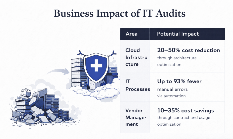 According to industry estimates, infrastructure optimization following a technology audit can reduce cloud costs by 20–50%.