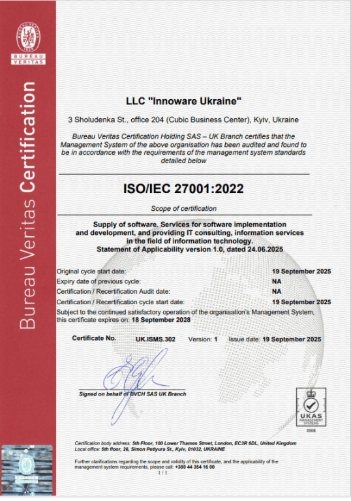 To obtain the Certificate ISO/IEC 27001, Innoware carried out extensive measures to adapt to the standard’s requirements and completed a comprehensive audit, which included an analysis of existing processes and their further improvement to comply with the ISO/IEC 27001:2022 standard.